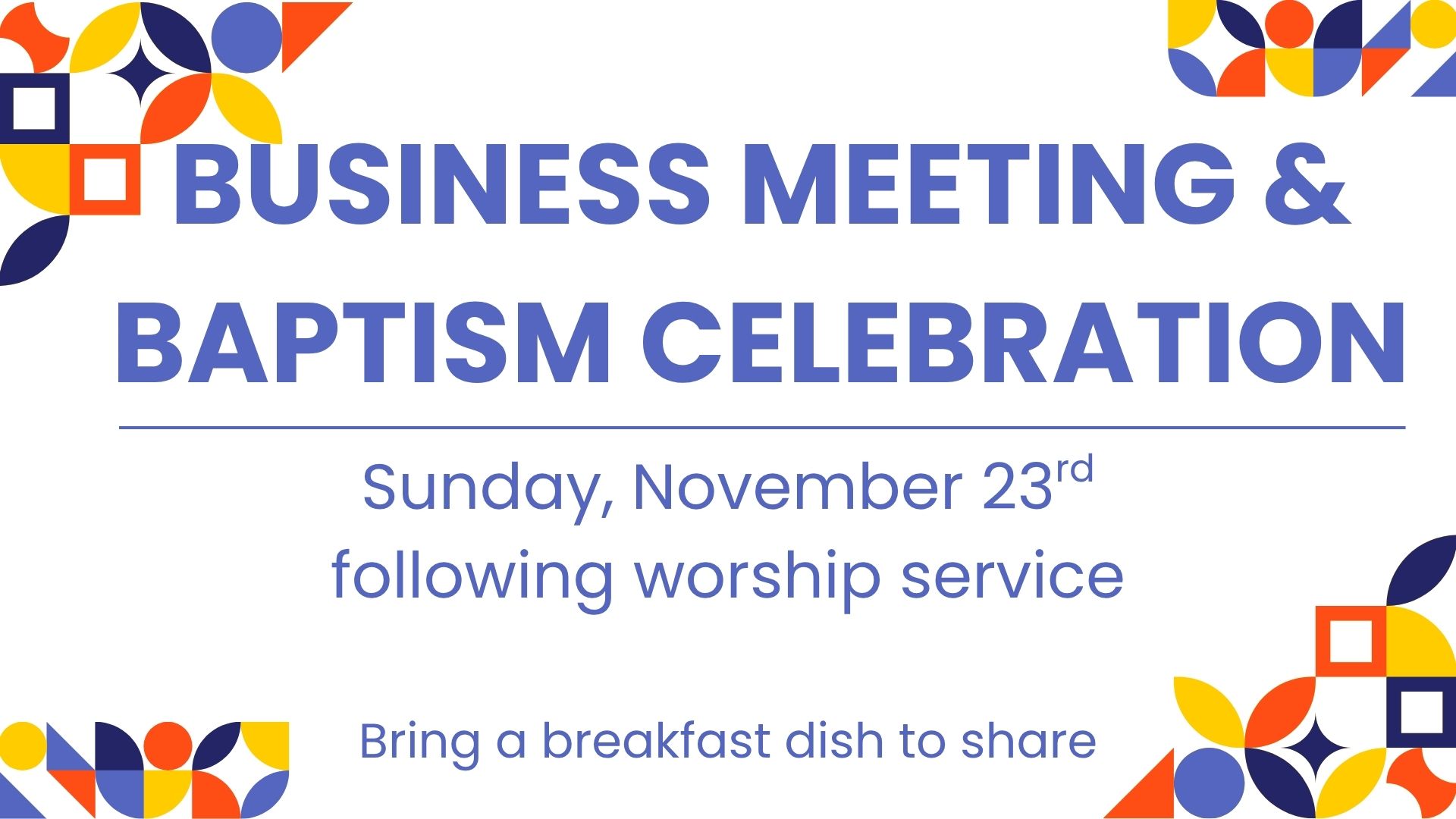 Category: Business Meetings Coordinator: Mike McQuittyJoin us on November 23 for our annual Business Meeting and for a baptism celebration! Please sign up to bring a breakfast dish as we celebrate what the Lord has been doing in our church!